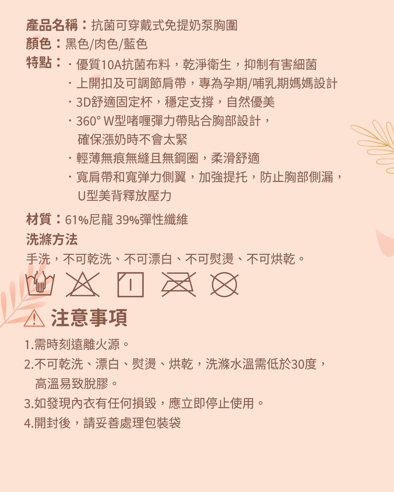 -洗滌方法:手洗,不可乾洗、不可漂白、不可熨燙、不可烘乾。